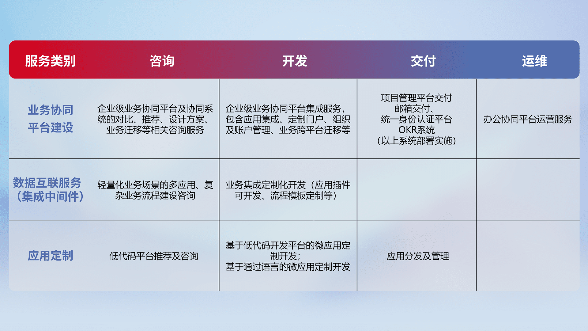 针对钉钉、、企微、、、IDaas等平台级产品提供产品的规划、、、方案、、、、交付、、定制化开发等服务,,实现如统一协同办公、、智能客户服务、、混合会议管理、、智能数据查询、、、、等业务场景,,,实现数字化转型。。。。