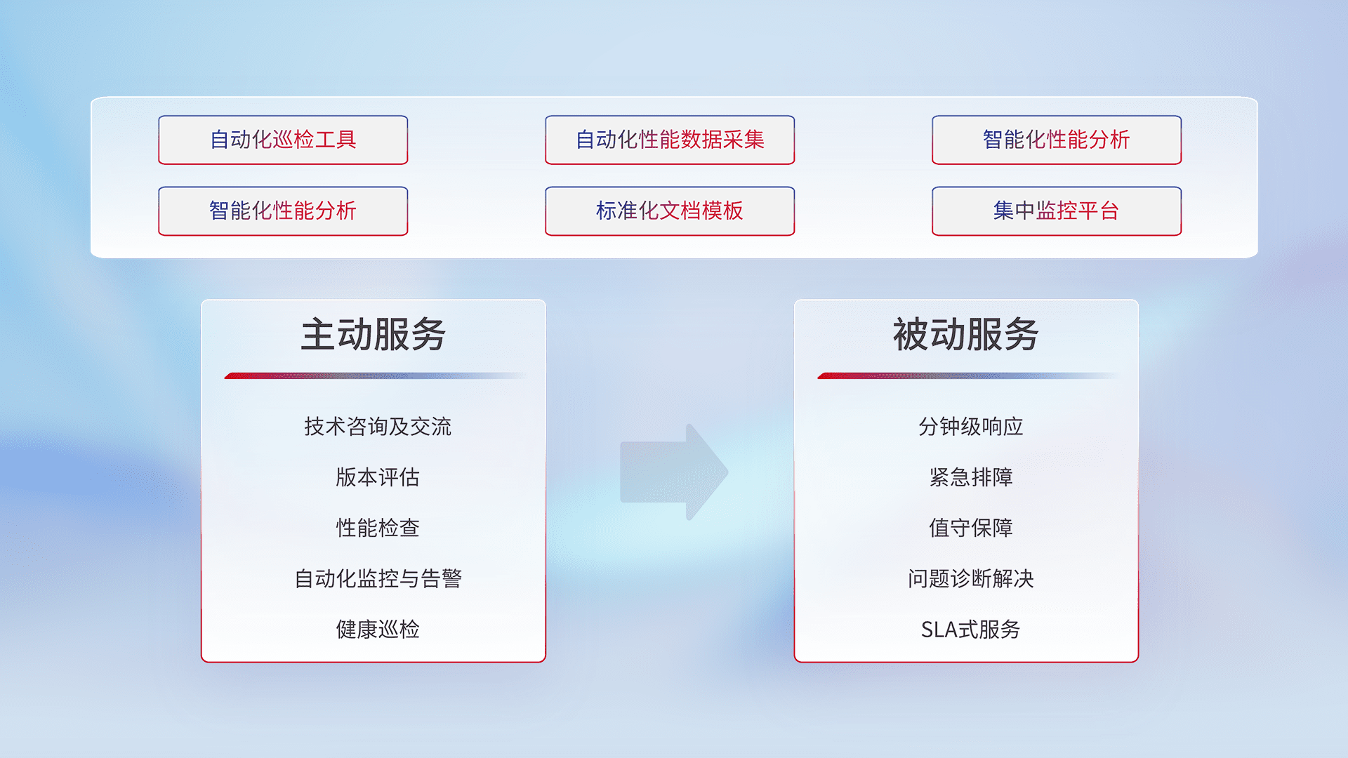 智能化工具和标准化文档,,保障服务质量,,,提供主动服务(包含技术咨询、、版本评估、、、、性能检查、、、、自动化监控与告警、、健康巡检)和被动服务包含(分钟级响应、、、紧急排障、、、值守保障、、、问题诊断解决、、SLA服务)。。