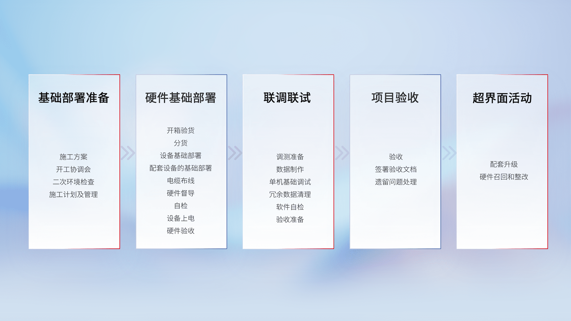 从基础部署准备、、、硬件基础部署、、、、联调联试、、、项目验收、、、越界面活动的全过程可追溯,,保证施工质量和进度。。。